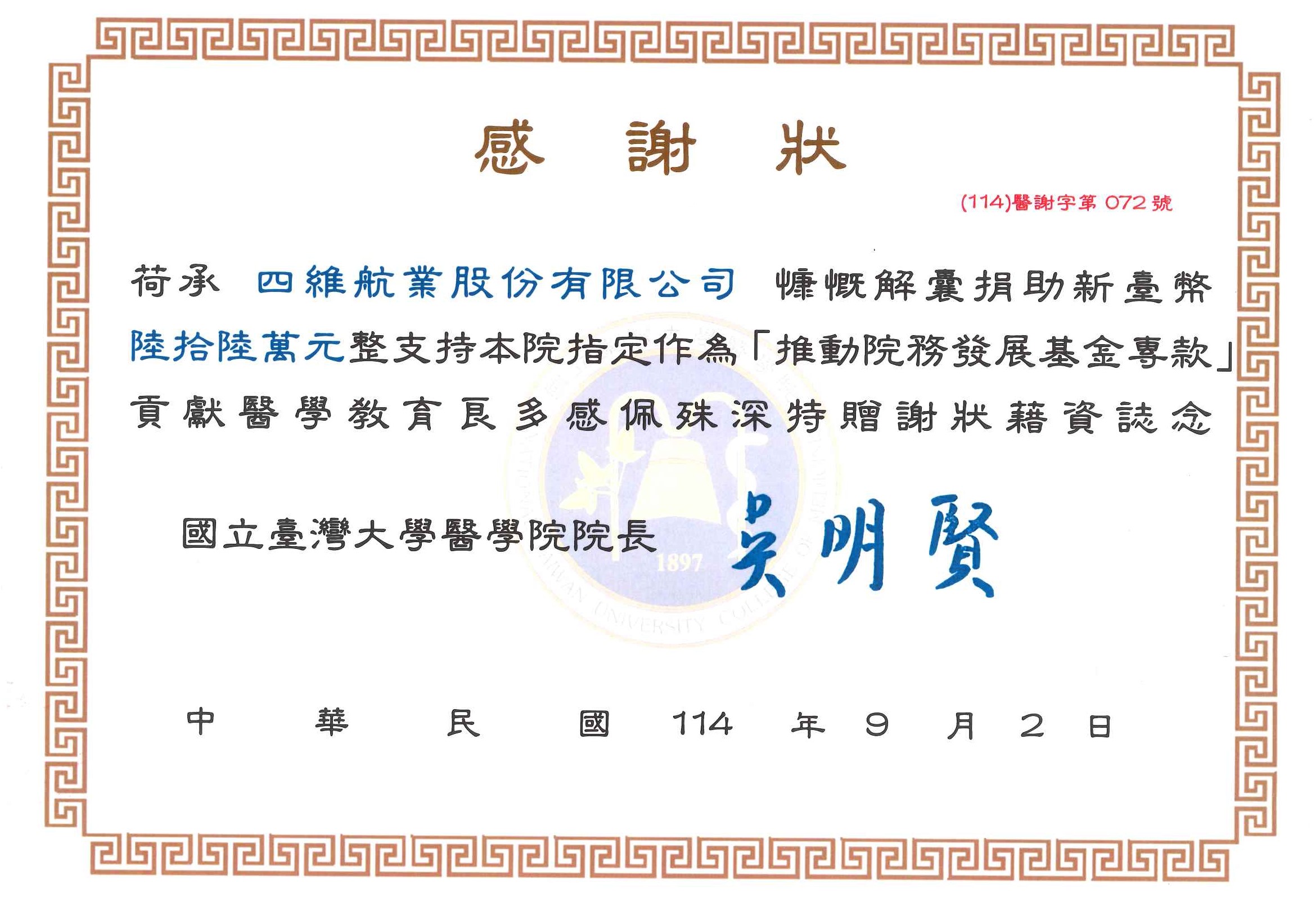 永續經營雖說是企業持續追求的願景,但在努力經營成長的同時,四維航業始終相信企業的力量也應該用來關懷社會、照顧人群,用自身影響力達到共善、共好的環境。帶著這個初衷,我們捐款新台幣六十六萬元予國立臺灣大學醫學院「臺大醫院院務發展基金」,期盼能為醫學研究與教育貢獻一份心力,並期待拋磚引玉讓更多企業成為推動健康永續的一份子。